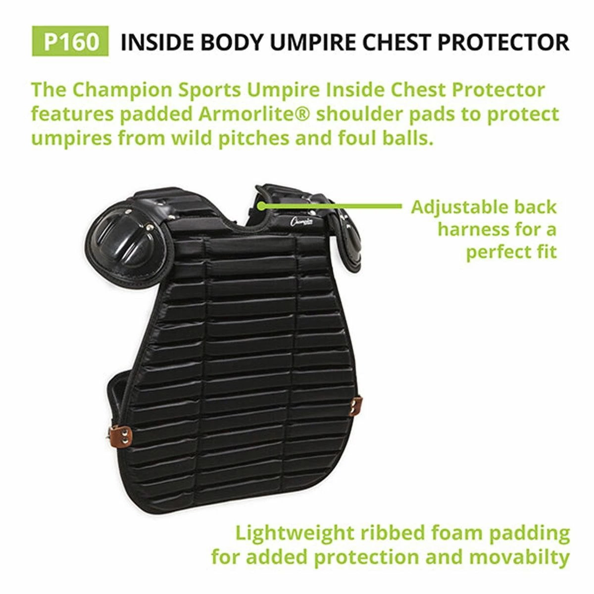 Champion’s inside umpire chest protector is designed for extra protection without sacrificing comfort. This lightweight chest protector features padded Armorlite® shoulder pads to protect umpires from wild pitches and foul balls. Separate arm pads and ribbed foam padding offer added protection while also providing a full range of motion. An adjustable back harness tailors to any size for a perfect fit. This chest protector is designed to wear under the umpire’s shirt.