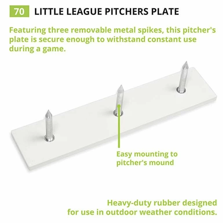 This official youth league pitcher’s plate is an economical solution for your ball field. Â Three metal spikes are included to hold it down securely and the rubber can easily be removed or replaced.