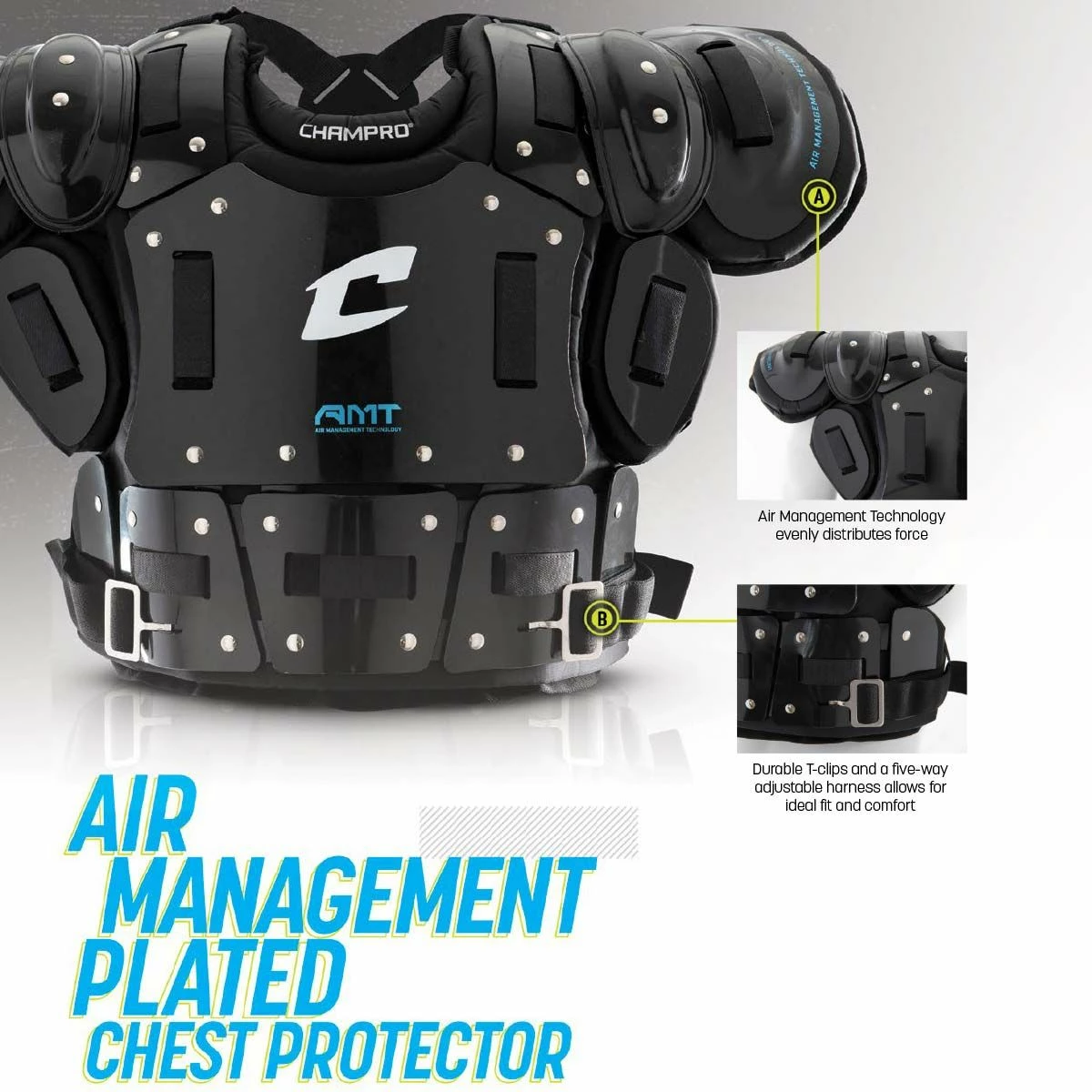 The plated umpire chest protector from Champro utilizes Air Management Technology to evenly distribute impact force from stray balls, providing ultimate protection behind the plate. Easily adjust for the ideal fit and comfort of this chest protector with the adjustable pectoral pads and the 5-way adjustable harness equipped with durable T-hook clips.