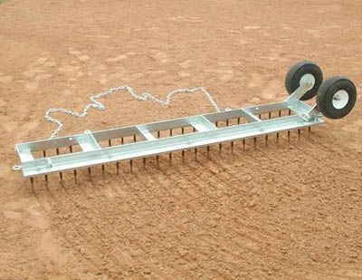 The Diamond Digger uses 4.5″ hard sharpened steel cutting teeth that can be replaced when worn. The pneumatic wheels allow you to roll for transport, instead of carrying it. This field groomer is features a hot dipped galvanized steel frame. A pull chain is provided on the front and there are hooks on the rear for easy attachment of any drag mat.  The Diamond Digger is designed to hold up to 3 cement building blocks (not included) for additional weight when necessary. Remove the wheels to turn the groomer over and use it as a leveling sled. It is recommended that a tractor pull the Diamond Digger.