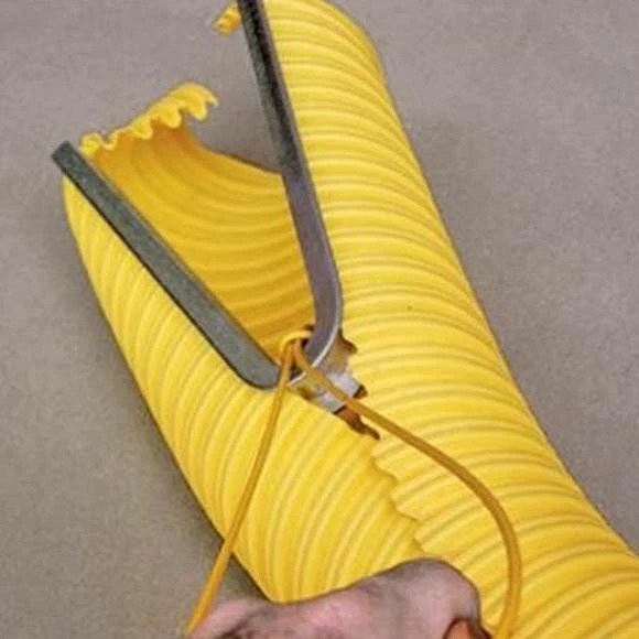 The fence cap zipper tool allows you to quickly and easily install your corrugated fence cap on a fence. The steel tool is designed to spread open a per-slit corrugated polypropylene fence cap and close the tubing over the fence as you move forward. This fence cap tool cuts installation time by 75%!