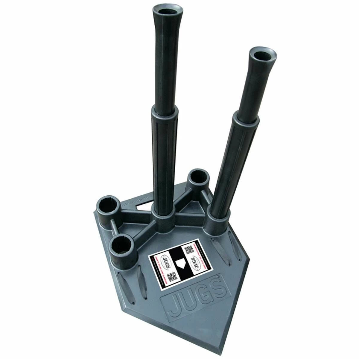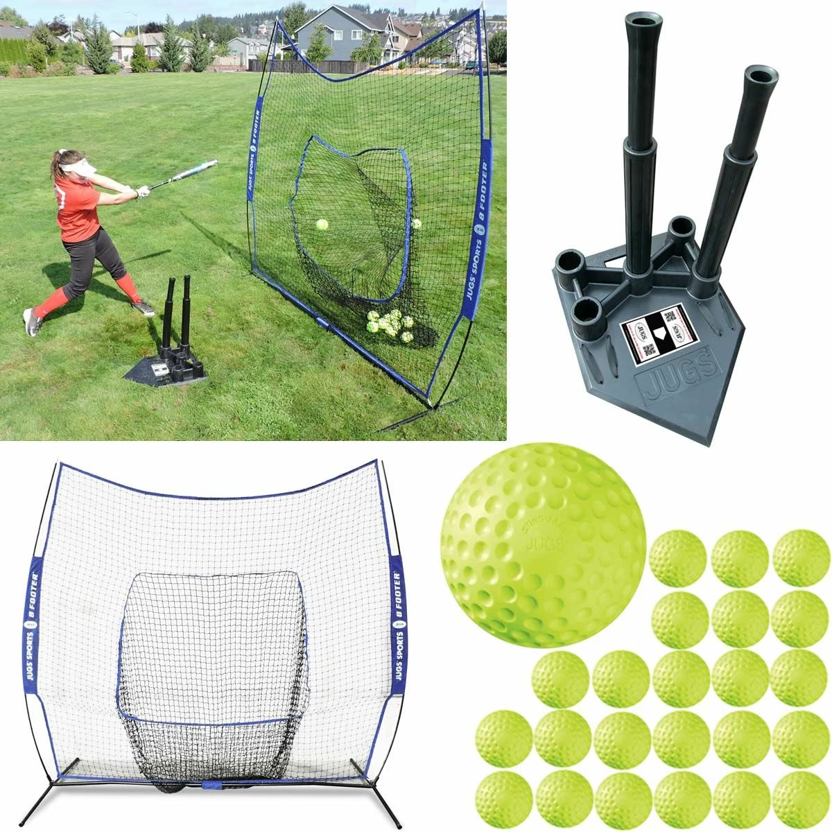 Get your cuts in anywhere with the portable Jugs 5-Point softball hitting tee package. This package includes a 5 position hitting tee that teaches the player to “hit the ball where it’s pitched,” an 8 foot travel screen and 2 dozen yellow dimpled sting-free softballs. The 5-Point batting tee (#A32-083) teaches correct contact points for inside, middle, and outside pitches. This tee works great to develop hand-eye coordination, a quicker bat and teaches the hitter to use the whole field. The 8′ travel hitting screen is perfect for tee practice, toss practice or soft toss practice and comes complete with a heavy-duty 43” nylon travel bag.
