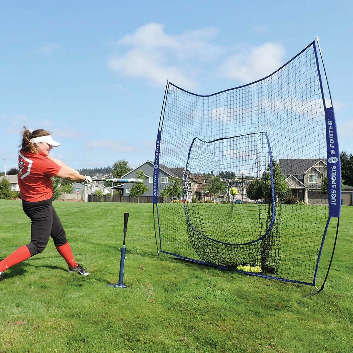 Take your cuts anywhere with the portable Jugs 8’ batting screen sock net. Featuring a pro-adept frame that is designed for heavy use, this portable hitting screen is perfect for tee practice, toss practice, or soft toss practice with regulation-sized baseballs and softballs. Measuring 8 feet by 8 feet, the sock net weighs only 18 pounds and can be carried with the included 43” nylon bag.