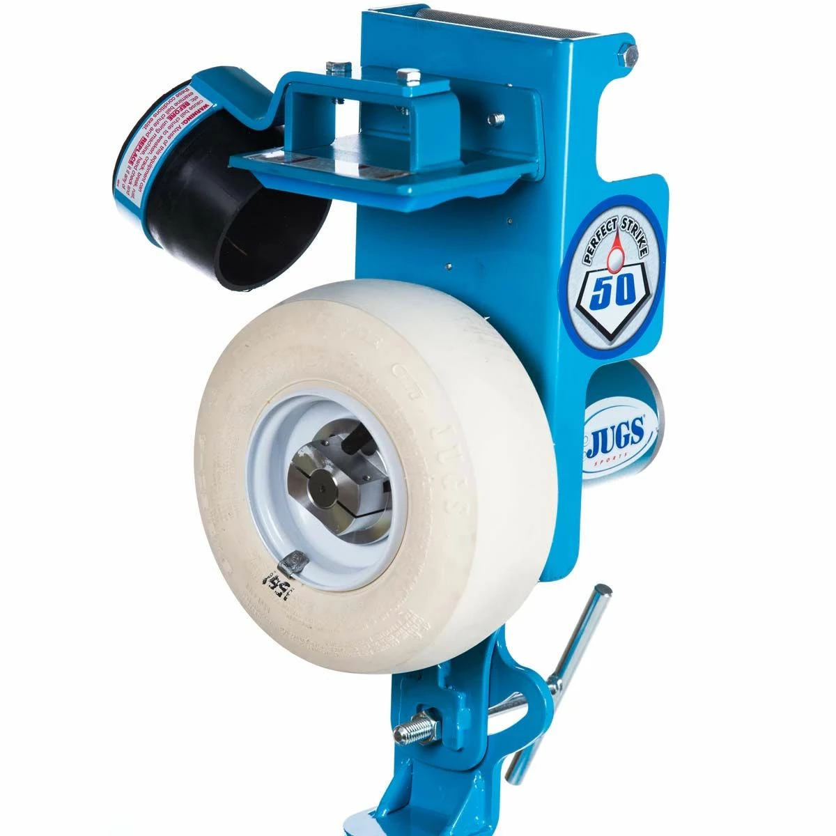 The Jugs softball hit at home backyard package allows you to have batting practice and perfect your swing in the comfort of your own backyard. The package includes the Jugs PS50™ pitching machine that allows you to set the speed you desire with a digital readout display. With a pitch speed up to 50 MPH, the PS50™ consistently throws perfect strikes, fly balls, and ground balls with the patented always-see-the-ball delivery system. The PS50 comes complete with a 9″ chute for baseball and a 12″ chute for fastpitch and slowpitch softball as well as adjustable legs. That way you see pitches thrown from a realistic point for both sports. The PS50 is the perfect introductory machine for young players. The batting cage frame measures 45’L x 11’W x 11’H and comes with a lite-flite slowpitch standard protective screen to keep the machine operator safe. The included twisted knotted black polyethylene netting is easily hung on the cage frame and is designed specifically for baseball and softball use. Knotted nets have a higher overall strength and durability rating making them superior for direct impact sports like baseball and softball. Twisted netting has a higher abrasion resistance than braided, because twisted has less surface area than braided. The polyethylene netting doesn’t absorb water, making it perfect for wet or humid hot climates. No permanent construction is required for the batting cage frame which 2 people can set up in less than 1 hour. The cage quickly dismantles simply unhooking the turnbuckles to lower entire cage to the ground. This package also includes 1 dozen yellow dimpled sting-free softballs.