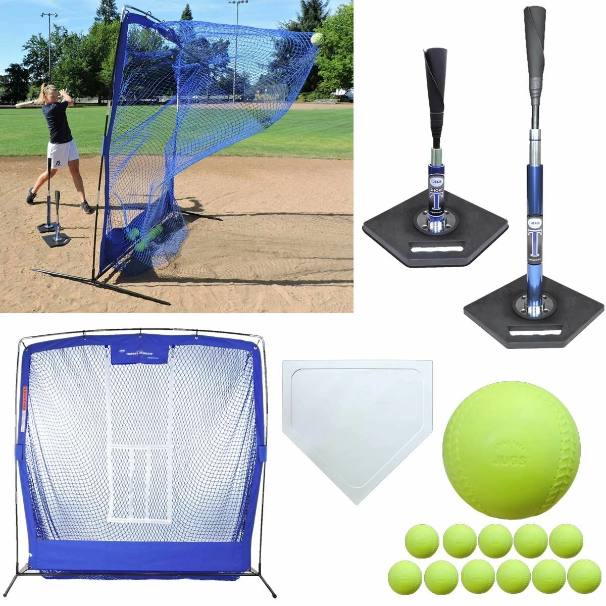 The Jugs softball T hitting station package has everything you need for a quick BP session anywhere. This batting practice package includes a 6.5′ x 6.5′ travel screen, the Jugs T batting tee (#A32-080). the Jugs Short T batting tee (#A32-082), 1 dozen seamed softballs and a throw-down home plate to simulate a realistic batting situation. The practice travel screen’s frame is made of stable 5/8″ fiberglass bungee poles with a sturdy 1″ steel tube base that won’t tip over in windy conditions. The screen features a white-lined strike zone as well as a collection area that holds hit balls. The travel screen comes complete with a 30″ nylon travel bag for easy transport. The Short T batting tee has a quick adjustment range of 16” to 23,” allowing hitters to work on the pitch at the bottom of the strike zone. The Jugs T batting tee features a quick adjustment range of 24” to 45” to simulate top of the zone pitch locations. Both batting tees are equipped with cut-out handles in the base for quick transport.