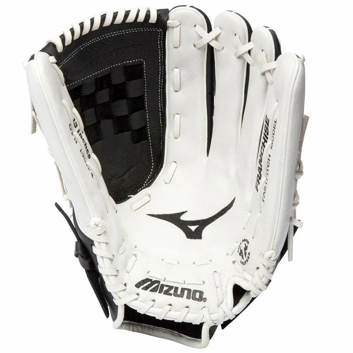 The Mizuno GFN1301F4 Franchise fastpitch softball glove is gender engineered and designed specifically for the female softball player. The Franchise youth’s 13″ size makes this versatile glove a good option for pitchers, infielders and outfielders. A pre-oiled full grain leather construction maintains durability and provides a soft, game-ready feel. The Parashock palm pad provides outstanding protection and comfort. The PowerLock wrist closure provides the quickest and most secure fit available. A double hinge heel with thumb and pinky hinges creates a centered, wider pocket. The QuikForm lace provides the easiest way to tighten the lace throughout the fingers. The glove’s Hilo lacing, an alternating lace pattern that retains the integrity of a fully-laced web with greater flexibility.