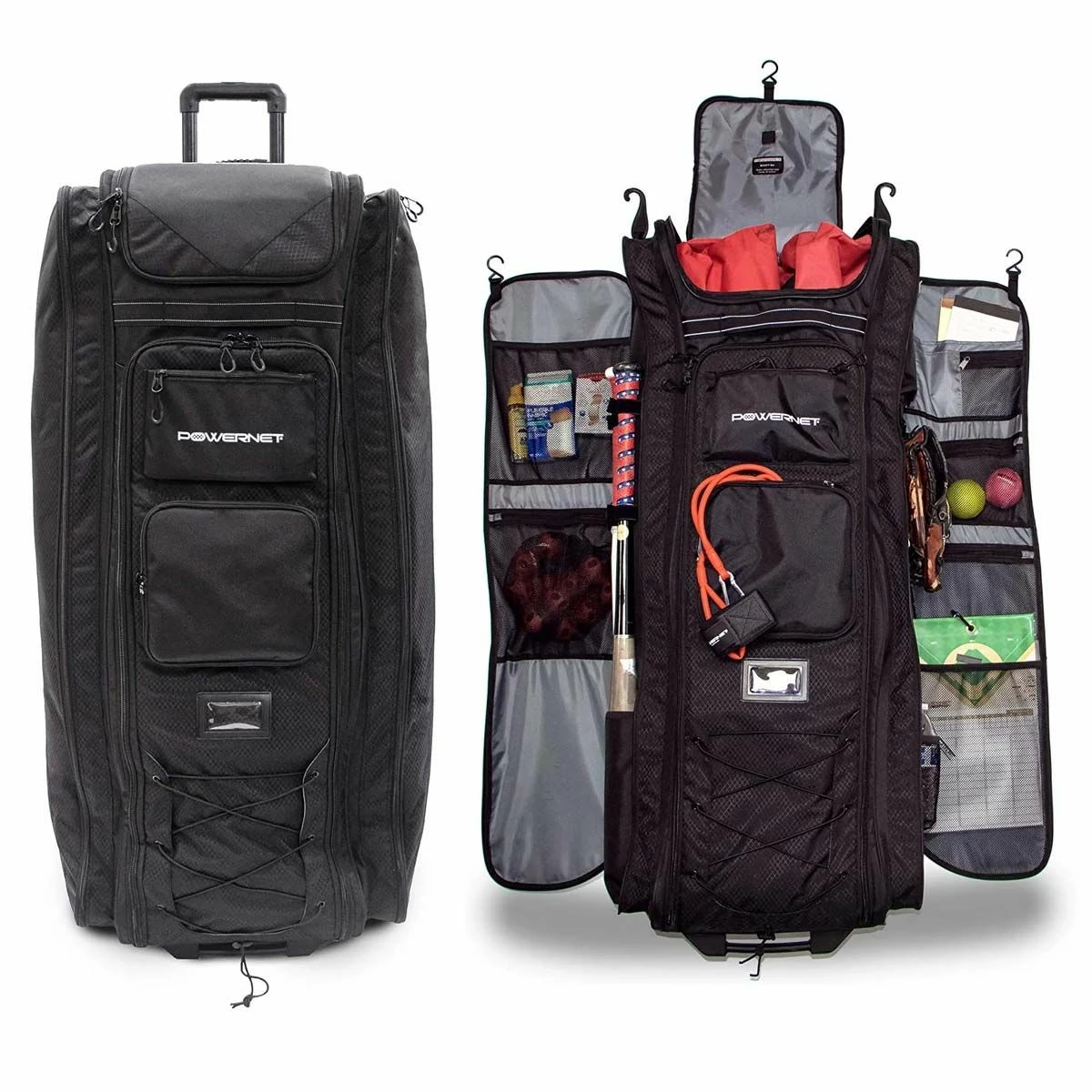 The Powernet rolling equipment bag is the ultimate all-in-one team travel bag for any baseball or softball coach. Measuring 46″H x 20″W x 15″D, this bag features a massive main compartment that easily fits up to four 7×7 style net carry bags or a combination of coaching equipment including shin guards and catchers gear. Keep one slot open to store multiple batting helmets or fielding gloves. The bag’s divider can be removed to create one large space for carrying your biggest items. This coaches bag is equipped with over 20 organization pockets and hooks to store everything from a coaching clipboard to a first aid kit. There’s a zippered, felt-lined valuables pocket to keep your cell phone and other devices scratch-free. Keep three full-size bats secured on the side bat panel pocket that features barrel sleeves and hook and loop latches. The bag’s durable fence hanging hooks allows you to keep the flaps open for easy access to all of your equipment. A hidden telescoping pull handle and durable large all terrain wheels make travel over asphalt, dirt or grass a breeze. Load the bag into your car with ease thanks to grab handles at several locations along the top, bottom, front and back. This wheeled equipment bag is reinforced with molded, durable plastic that surrounds the bottom side along with heavy-duty fabric that is resistant to wear and tear. Support rails are implemented on the back of the bag to prevent tearing.