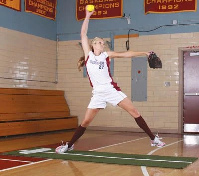 A great softball pitching aid, the Jennie Finch pitching mat comes with a regulation pitching rubber attached. The Power Line mat has a 2″ inlaid white line for more precise training for pitchers of all ages. Each mat comes with a convenient carrying case. The fastpitch pitching mat is made from spike-resistant, extremely durable artificial turf with a special rubberized backing that is guaranteed not to slip on gym floors.
